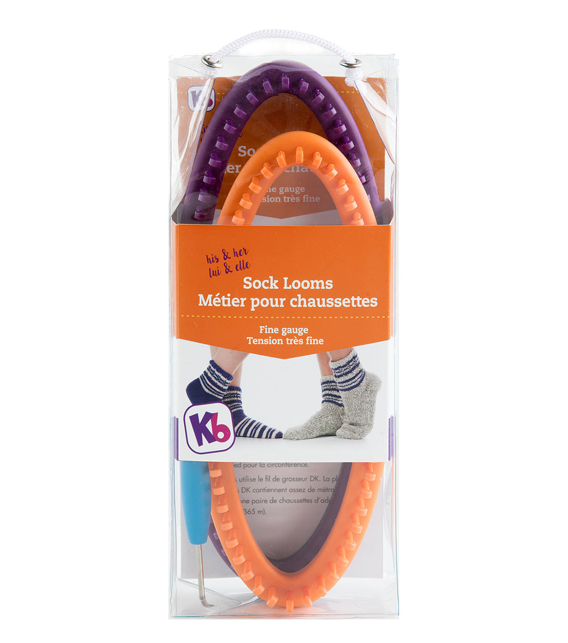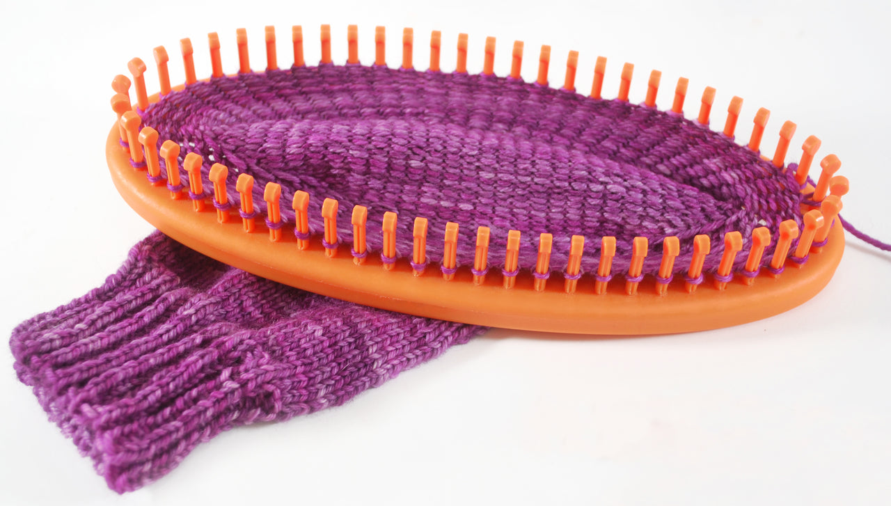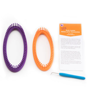 (2) fine gauge sock looms in one pack! Purple loom, 64 pegs for large adult, and the orange loom, 56 pegs, small adult size... no counting pegs! Great for beginners and new loom knitters. Plastic pegs provide a little extra give in working your stitches. Recommend DK or sock weight yarn.